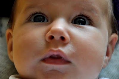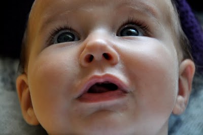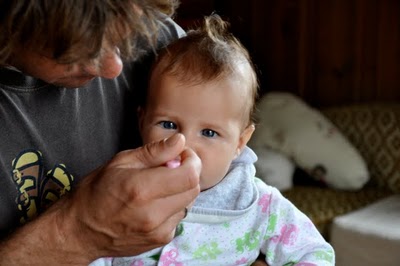 Our little monkey is loving her porridge! The moment she sees the spoon in close proximity, she opens her mouth and gets this eager look in her eye, like a little baby bird. It really is a relief that she likes it so much, as she has been very fussy up to now and has not been at all interested in anything except for the real thing (plastic? not having any of it!)... So we'll celebrate her healthy appetite with some more photos of our little monster, grr! :)